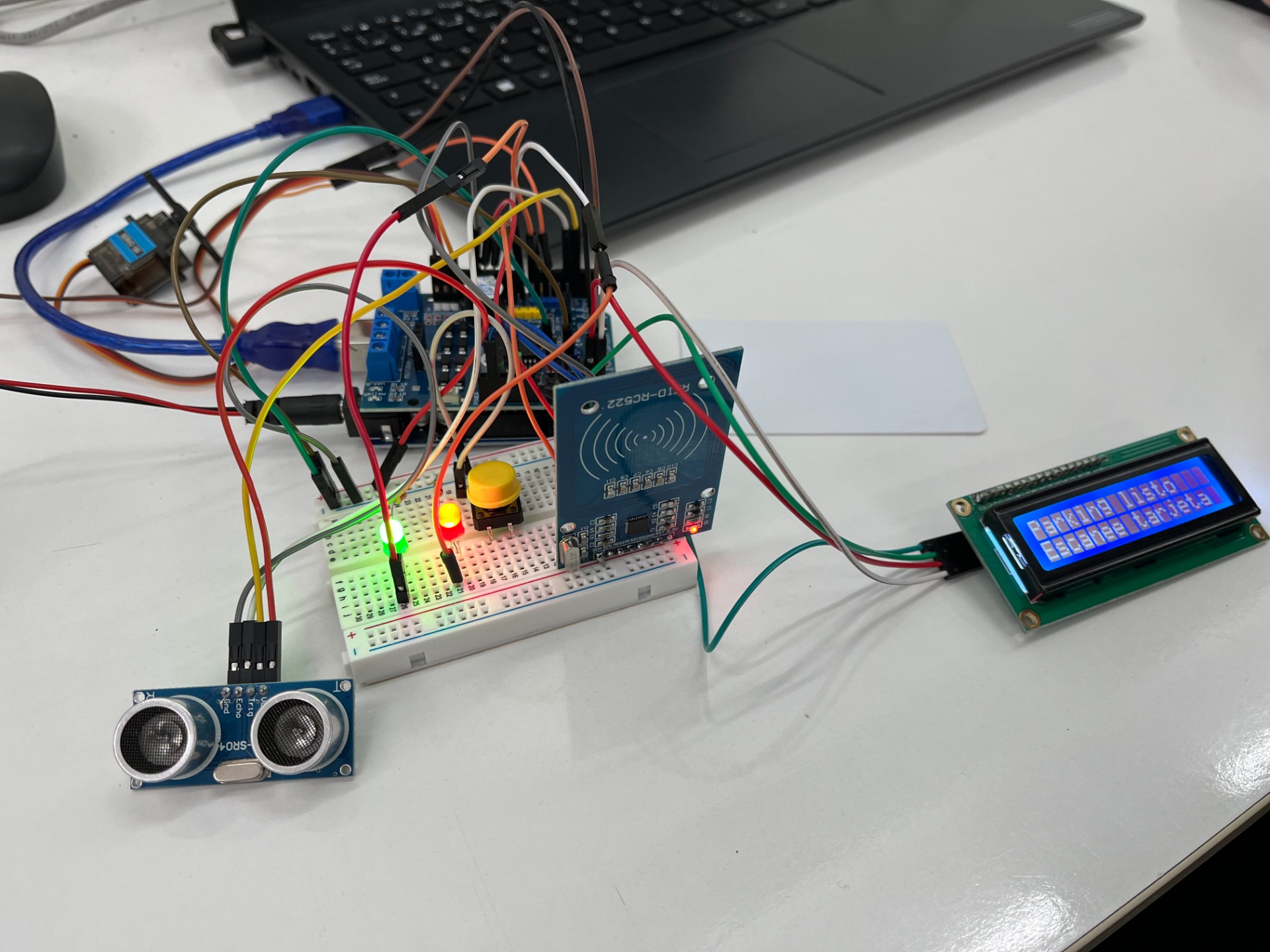 Ya hemos conseguido terminar el circuito del parking y que funcione todo bien. Cuando pasan la tarjeta por el RDIF 3 veces (número de plazas), se detecta que está lleno y si intenta entrar otro coche, la barrera (servomotor) le deniega el paso. Pero si un coche sale (se abre la barrera por la detección de un ultrasonidos), ya hay espacio para otro más. Los LED se encienden de un color u otro si se permite o no el paso del coche.