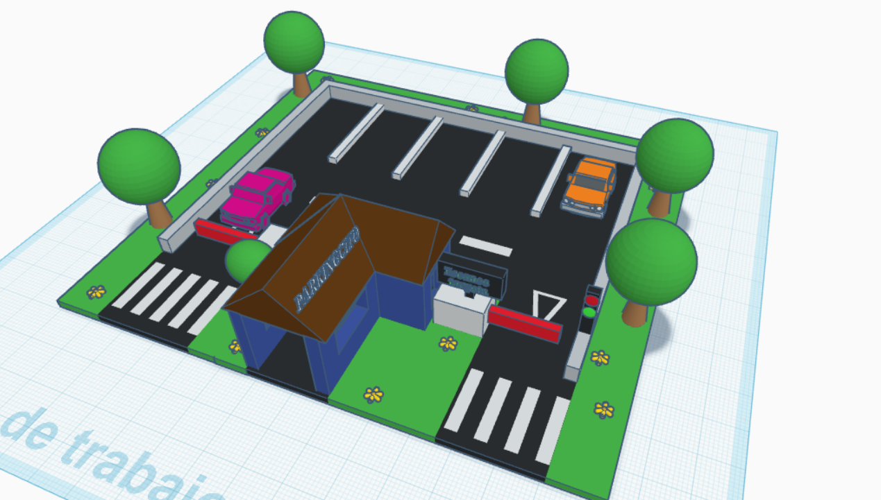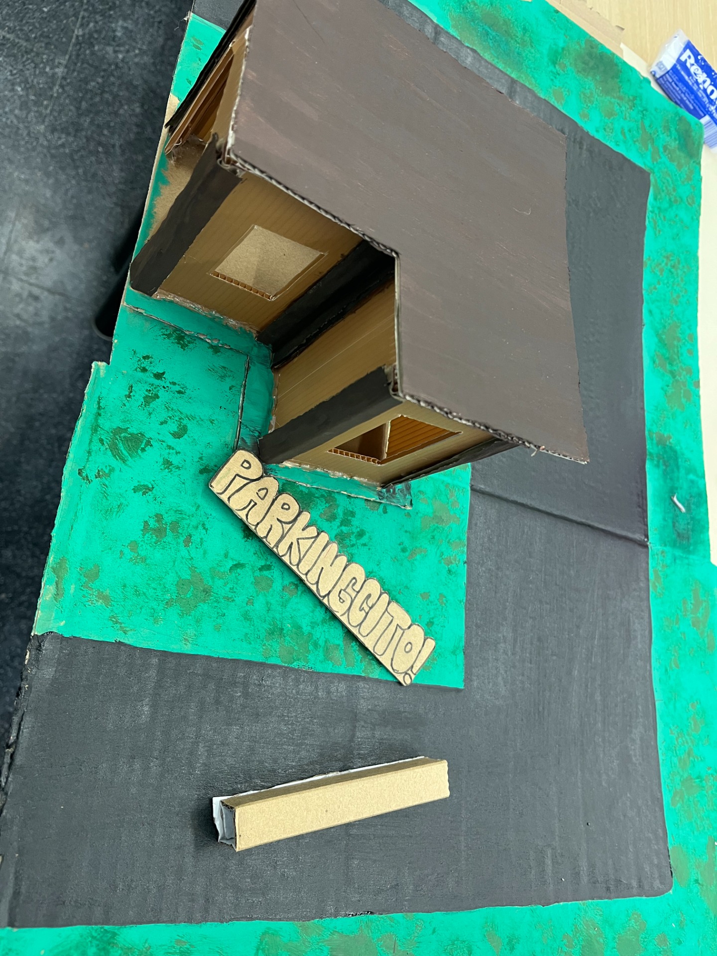 Hoy hemos terminado de pintar la base aunque nos quedan aun las rayas de señalización de la carretera, le hemos añadido toques de otro tono de verde para hacer ver más realista el césped. Además, hemos empezado a hacer los troncos para los arboles y la señal con el nombre del parking que irá en el techo de la casa.