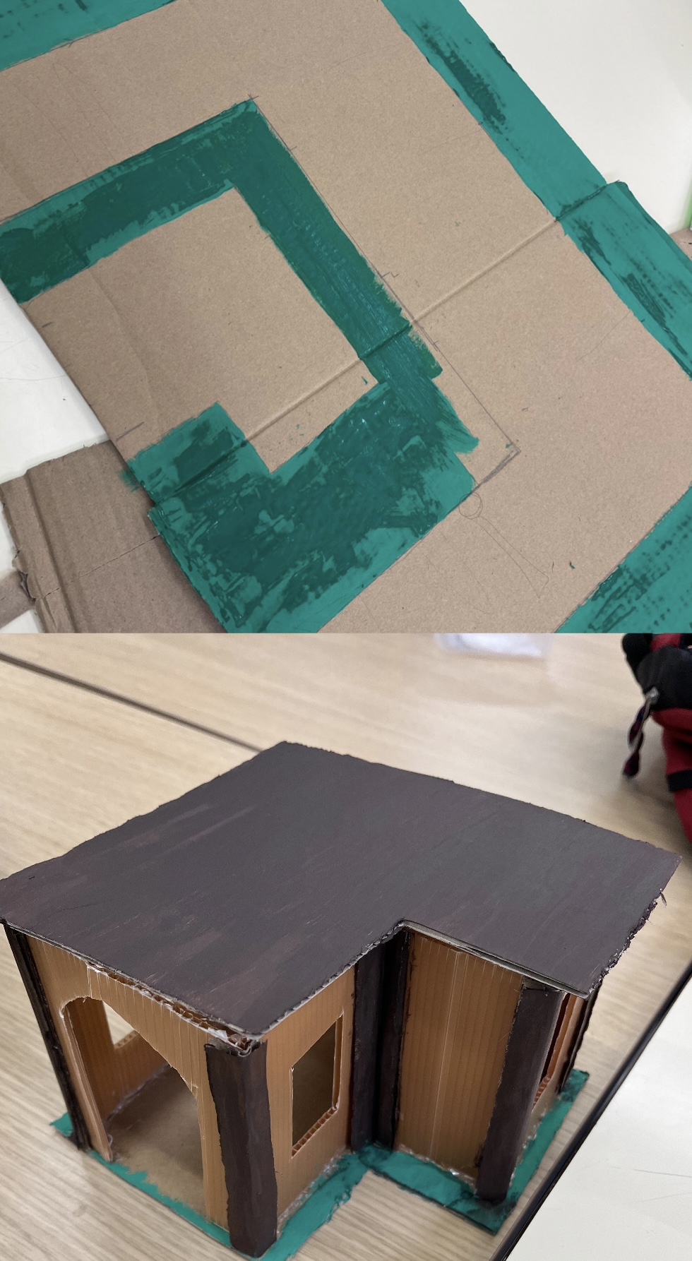 Ya hemos marcado las medidas de la base de la maqueta, carreteras, casa, entrada y salida, etc. Además, hemos terminado de pintar el tejado y los pilares de la casa, por lo que ya está terminada esa parte, solo nos falta unos arbustos para decorar. Y hemos empezado a pintar la base.