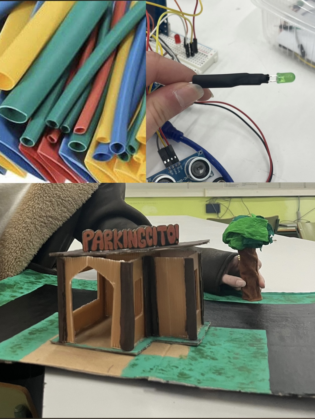 Para la parte donde van los LEDs, en nuestra maqueta de Tinkercad están como en un semáforo, así que para hacer los cables más resistentes y seguros les hemos puesto tubos termorretráctiles (los de colores), se adaptan a la forma del cable mediante el calor.