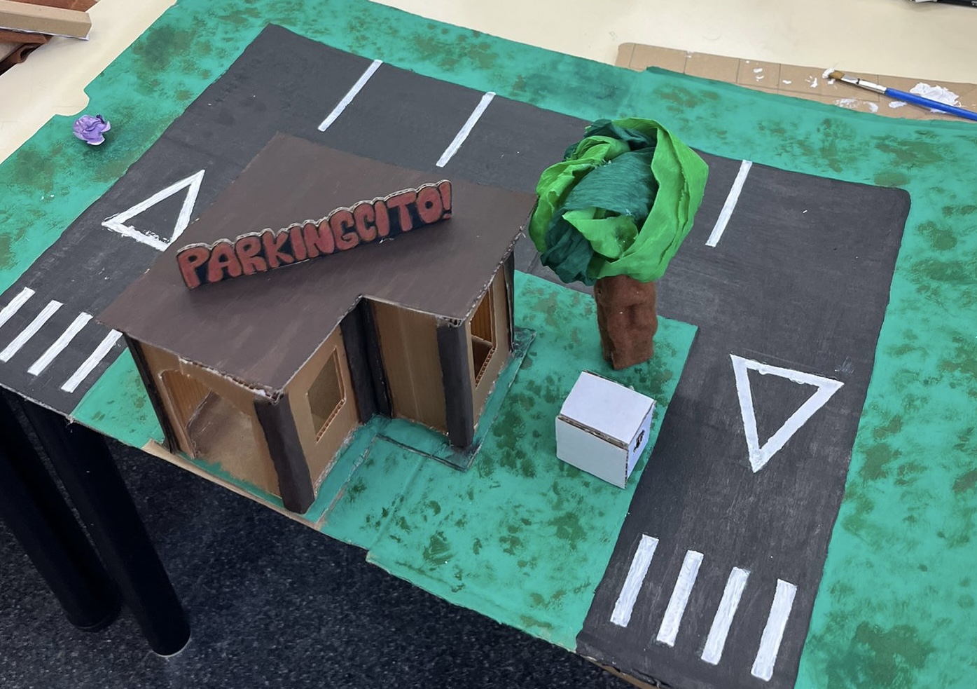Hoy hemos terminado el cartel con el nombre de nuestro parking y lo hemos pegado en el techo de la casita. Además, hemos terminado de hacer nuestro primer árbol, hecho de tela marrón para el tronco y papel pinocho para las hojas (el cual utilizaremos también para los arbustos), tenemos pensado hacer unos pocos más y poner unas flores pequeñas que hemos comprado, para dar un entorno más bonito y realista. También hemos hecho plantillas para las líneas blancas del suelo de señalización del parking, así que el próximo día las pintaremos.